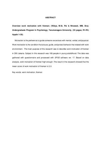 Putra, Benny (2009) Gambaran motivasi kerja pada petugas pemadam kebakaran. Skripsi thesis, Universitas Tarumanagara.