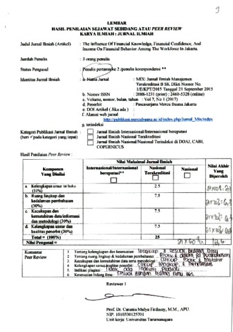 Agus Zainul Arifin, peer review and Kevin, peer review and Halim Putera S, peer review (2017) Review 08 Agus Zainul Arifin, Kevin Dan Halim Putera S. Review : The Influence Of Financial Knowledge, Financial Confidence, And Income On Financial Behavior Among The Workforce In Jakarta, 7 (1). pp. 37-47. ISSN 2460-5328 / 2088-1231