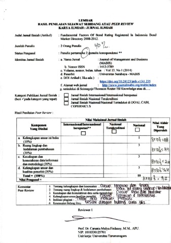 Felix, peer review and Agus Zainul Arifin, peer review (2014) Review 13 Felix, Agus Zainul Arifin. Review : Fundamental Factors Of Bond Rating Registered In Indonesia Bond Market Directory 2008-2012., 13 (1). pp. 69-80. ISSN 1412-3789