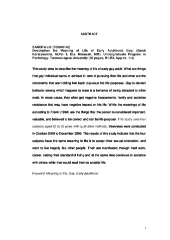 This study aims to describe the meaning of life of early gay adult. What are things that gay individual wants to achieve in term of pursuing their life and what are the constraints that are holding him back to pursue his life purposes. Gay is deviant behavior among which happens to male is a behavior of being attracted to other male. In mose cases, they often get negative harassments, family and societies resistance that may have negative impact on his life. While the meanings of life according to Frankl (1984) are the things that the person is considered important, valuable, and believed to be correct and can be life purpose. This study uses four subjects aged 25 to 35 years with qualitative methods. Interviews were conducted in October 2009 to December 2009. The results of this study indicate that the four subjects have the same meaning in life is to accept their sexual orientation, and want to live happily like other people. Their are manifested through hard work, career, raising their standard of living and at the same time continues to socialize with others while that would lead them to a better life.