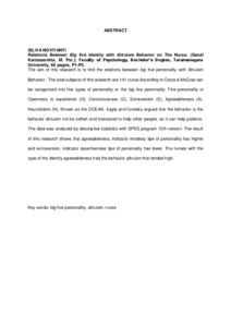 The aim of this research is to find the relations between big five personality with Altruism Behavior. The total subjects of this research are 141 nurse.According to Costa & McCrae can be categorized into five types of personality or the big five personality. Five personality is Openness to experience (O), Consciousness (C), Extraversion (E), Agreeableness (A), Neuroticism (N). Known as the OCEAN. Eagly and Crowley argued that the behavior is the behavior altruism not be selfish and interested to help other people, so it can help patients. The data was analyzed by descriptive statistics with SPSS program 15th version. The result of this research shows that agreeableness, indicator modesty tipe of personality has higher and extraversion, indicator assertiveness tipe of personality has lower. The nurses with the type of the identity agreeableness had the behavior altruism that tended high.