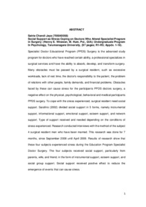 Specialist Doctor Educational Program (PPDS) Surgery is the advanced study program for doctors who have reached certain ability, a professional specializes in surgical services and have the ability to absorb, develop, and transform surgery. Many obstacles must be passed by a surgical resident, such as excessive workloads, lack of rest time, the doctor's responsibility to the patient, the problem of relations with other people, family demands, and financial problems. Obstacles faced by these can cause stress for the participants PPDS doctors surgery, a negative effect on the physical, psychological, behavioral and medical participants PPDS surgery. To cope with the stress experienced, surgical resident need social support. Sarafino (2002) divided social support in 5 forms, namely instrumental support, informational support, emotional support, esteem support, and network support. Type of support received and needed depending on the conditions of stress experienced. Research conducted interviews with the method of the subject 4 surgical resident men who have been married. This research was done for 7 months, since September 2008 until April 2009. Results of research show that these four subjects experienced stress during the Education Program Specialist Doctor Surgery. The four subjects received social support, particularly from parents, wife, and friend, in the form of instrumental support, esteem support, and social group support. Social support received positive effect to reduce the emergence of events that can cause stress.