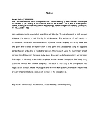 Halim, Angel (2009) Gambaran konsep diri remaja akhir yang melakukan cross dressing (Studi kasus cross-player di Jakarta). Skripsi thesis, Universitas Tarumanagara.