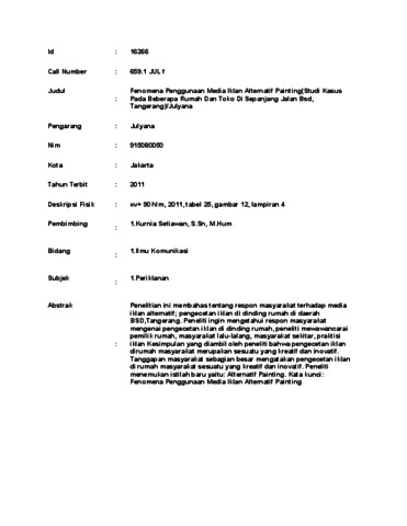 Julyana, Julyana (2011) Fenomena Penggunaan Media Iklan Alternatif Painting(Studi Kasus Pada Beberapa Rumah Dan Toko Di Sepanjang Jalan Bsd, Tangerang)/Julyana. Skripsi thesis, UNIVERSITAS TARUMANAGARA.