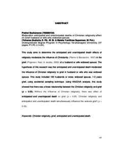 This study aims to determine the anticipated and unanticipated death effects of religiosity moderates the influence of Christianity (Plante & Boccaccini, 1997) in the grief (Prigerson, Kasl, & Jacobs, 2000) of a husband or wife widowed spouse. The hypothesis of this research was that anticipated and unanticipated death moderated the influence of Christian religiosity to grief in husband or wife who was widowed spouse. This study included 100 husbands or wives widowed spouse, 1-2 years grief, using accidental sampling technique. Using ANCOVA analysis, this study showed that there was a linear relationship between the Christian religiosity and grief (p < 0.05). Without the influence of Christian religiosity, there was effect of anticipated and unanticipated death on grief (p < 0.05). Christian religiosity and anticipated and unanticipated death simultaneously influence the widow’s grief (p < 0.05).
