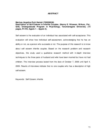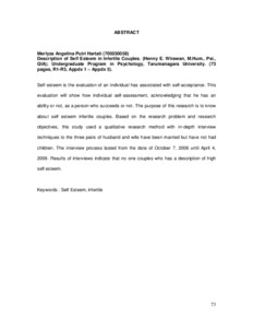 Hartati, Merlyza Angelina Putri (2010) Gambaran Self esteem pada pasangan infertile. Skripsi thesis, universitas Tarumanagara.