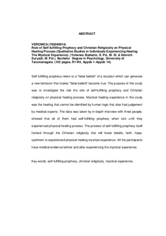 "Self fulfilling prophecy refers to a ""false beliefs"" of a situation which can generate a new behavior that makes ""false beliefs"" become true. The purpose of this study was to investigate the role the role of self-fulfilling prophecy and Christian religiosity on physical healing process. Mystical healing experience in this study was the healing that cannot be identified by human logic that also had judgement by medical experts. The data was taken by in-depth interview with three people, showed that all of them had self-fulfilling prophecy when sick until they experienced physical healing process. The process of self-fulfilling prophecy itself formed through the Christian religiosity that will foster beliefs, faith, hope, optimism to experienced physical healing mystical experience. All the participants have medical evidence before and after experiencing the mystical experience.