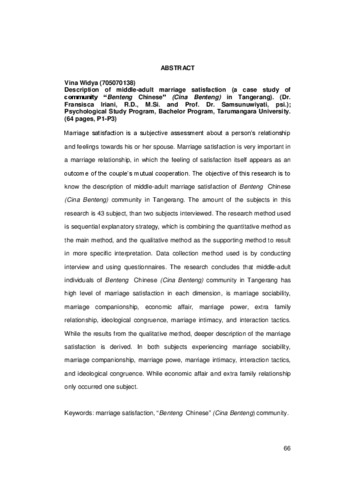Widya, Vina (2011) Gambaran Kepuasan Pernikahan Dewasa Madya (Studi Kasus Pada Komunitas “Cina Benteng” di Tanggerang). Skripsi thesis, universitas Tarumanagara.