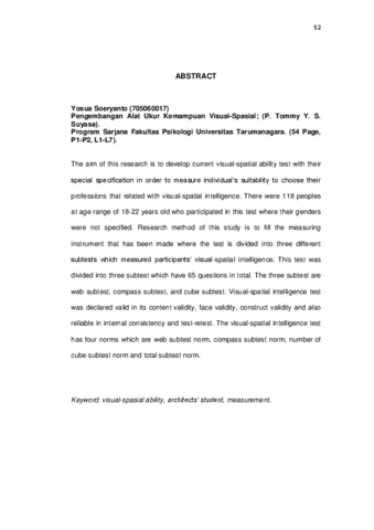 Soeryanto, Yosua (2011) Pengembangan Alat Ukur Kemampuan Visual-Spasial. Skripsi thesis, universitas Tarumanagara.