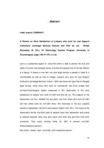 Law is a substantial aspect of social life which is able to protect the duty and rights of human that emerges sense of justice and peace.One of the law officers is a lawyer. A lawyer is one who can give legal service to people in need of it commercially as well as free of charge. Lawyers who work for Law Support Institutions (Lembaga Bantuan Hukum / LBH) are those who give free of charged legal service, while those who work for commercial law firms charge their services.Psychological aspect measured in this observation is the work satisfaction of lawyers who work for LBH and who do not. The subjects of the observation are four, divided into two parts: two from those who work for LBH and two others work for non-LBH firms. The interviews to the four subjects started in September 10th,2010 and ended in March 15th, 2011. The result of the observation shows that both pairs of lawyers have their satisfaction and justice or balance between what they give (input) and what they get from their work (outcome). They enjoy working either for LBH or present non-LBH firms(comparison person).