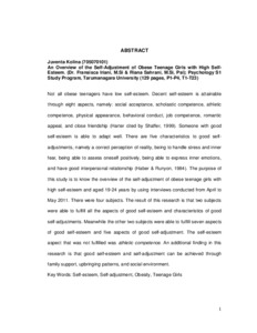Not all obese teenagers have low self-esteem. Decent self-esteem is attainable through eight aspects, namely: social acceptance, scholastic competence, athletic competence, physical appearance, behavioral conduct, job competence, romantic appeal, and close friendship (Harter cited by Shaffer, 1999). Someone with good self-esteem is able to adapt well. There are five characteristics to good self-adjustments, namely a correct perception of reality, being to handle stress and inner fear, being able to assess oneself positively, being able to express inner emotions, and have good interpersonal relationship (Haber & Runyon, 1984). The purpose of this study is to know the overview of the self-adjustment of obese teenage girls with high self-esteem and aged 19-24 years by using interviews conducted from April to May 2011. There were four subjects. The result of this research is that two subjects were able to fulfill all the aspects of good self-esteem and characteristics of good self-adjustments. Meanwhile the other two subjects were able to fulfill seven aspects of good self-esteem and five aspects of good self-adjustment. The self-esteem aspect that was not fulfilled was athletic competence. An additional finding in this research is that good self-esteem and self-adjustment can be achieved through family support, upbringing patterns, and social environment.
