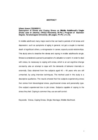 Anwar, Idham (2011) Gambaran stress dan coping stress pada wanita dewasa madya yang belum menikah. Skripsi thesis, universitas Tarumanagara.