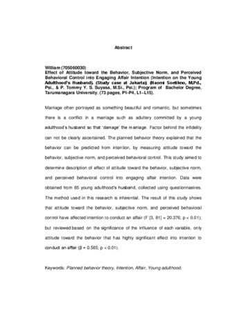 William, William (2011) Pengaruh attitude toward the behavior, subjective norm, perceived behavioral control terhadap intensi untuk melakukan perselingkuhan (intensi pada kaum suami dewasa muda). Skripsi thesis, Universitas Tarumanagara.