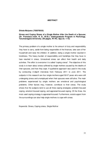 The primary problem of a single mother is the amount of duty and responsibility they have to carry, aside from being responsible of the finances, take care of her household and raise the children. In addition, being a single mother resulted in loneliness. The heavy burden of responsibility and hardships that they have to face resulted in stress. Unresolved stress can affect their health and daily activities. The effort to overcome it is called “coping stress”. The objective of this study is to learn about stress suffered by single mothers caused by the deaths of their spouses, and how they cope. A qualitative approach was used in this study by conducting in-depth interviews from February 2011 to June 2011. The subjects in this research are four single mothers aged 50-57 years who were still undergoing stress and unemployed when their spouses were still alive. The main problems experienced by single mothers are emotional and psychological problems. Other factors may, however, contribute to their stress. The study shows that the subjects tend to use all three coping strategies: problem-focused coping, emotion-focused coping, and appraisal-focused coping. Of the three, the most used coping strategy is appraisal-focused. Furthermore, social support from the surroundings can also help single mothers to cope with stress.