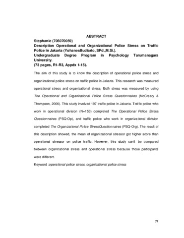 The aim of this study is to know the description of operational police stress and organizational police stress on traffic police in Jakarta. This research was measured operational stress and organizational stress. Both stress was measured by using The Operational and Organizational Police Stress Questionnaires (McCreary & Thompson, 2006). This study involved 197 traffic police in Jakarta. Traffic police who work in operational division (N=153) completed The Operational Police Stress Questionnaires (PSQ-Op), and traffic police who work in organizational division completed The Organizational Police StressQuestionnaires (PSQ-Org). The result of this description showed, the mean of organizational stressor got higher score than operational stressor on police traffic. However, this study can’t be compared between organizational stress and operational stress because those participants were different.