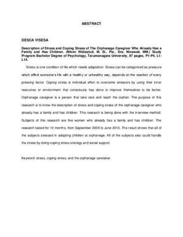 Visesa, Desca (2010) Gambaran stress dan coping stress pengasuh di panti asuhan yang sudah berkeluarga dan memiliki anak. Skripsi thesis, Universitas Tarumanagara.