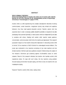 Arindia, Rifka (2012) Stress dan coping stress pada guru yang menangani anak autis. Skripsi thesis, Universitas Tarumanagara.