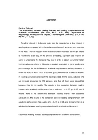 Tjahyadi, Patricia (2012) Hubungan antara minat membaca dan kemampuan memahami bacaan terhadap prestasi belajar (Studi pada mahasiswa Fakultas Psikologi Universitas “X”). Skripsi thesis, Universitas Tarumanagara.