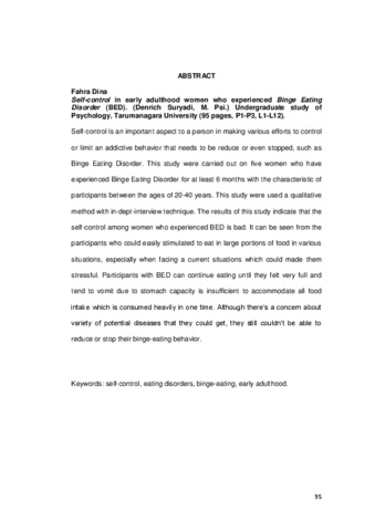 Dina, Fahra (2012) Gambaran self-control pada wanita dewasa awal yang mengalami binge eating disorder (BED). Skripsi thesis, Universitas Tarumanagara.