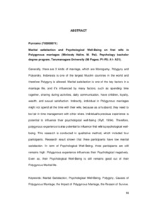 Generally, there are 3 kinds of marriage, which are Monogamy, Polygyny and Polyandry. Indonesia is one of the largest Muslim countries in the world and therefore Polygyny is allowed. Marital satisfaction is one of the key factors in a marriage life, and it’s influenced by many factors, such as spending time together, sharing during activities, daily communication, have children, loyalty, wealth, and sexual satisfaction. Indirectly, individual in Polygynous marriages might not spend all the time with their wife, because as a husband, they need to be fair in time management with other wives. Individual’s precious experience is potential to influence their psychological well-being (Ryff, 1994). Therefore, polygynous experience is also potential to influence first wife’s psychological well-being. This research is conducted in qualitative method, which included four participants. Research result shown that three participants have low marital satisfaction. In term of Psychological Well-Being, three participants are still remains high. Polygynous experience influences their Psychological negatively. Even so, their Psychological Well-Being is still remains good out of their Polygynous Marital life.