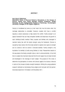 Divorce is considered by some as a last resort that must be taken when the marriage relationship is untenable. However, couples who have a conflict requires a certain assistance to help resolve the conflict. Family strength is an aspect framework that can help strengthen families and help boost the growth of each individual family member. Many couples and families who managed to maintain family ties with the family strength using the framework. Divorce is caused by many factors that this study wanted to explore more types of strength are not owned or did not evolve in divorced families. Family strength is the foundation for families to build strong families or intact. Researchers based on the assumption that family strength is less a role in a divorced family. In the third life of a subject that has been observed that the sixth aspect has not been formed and developed in the marriage of each subject. The purpose of this study to determine the perceptions of women who divorce against the causes of divorce in terms of the concept of family strength framework. Writing this using qualitative research methods by interviewing three subjects who had split with her partner. Interviews lasted from 16 October to 26 November 2011.