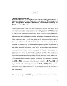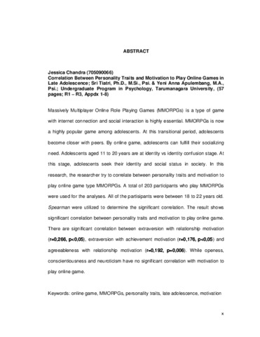 Massively Multiplayer Online Role Playing Games (MMORPGs) are a type of game with internet networks that require social interaction. MMORPGs are now a very popular game among teenagers. During this transition period teenagers become closer to their peers. Through online games, teens can fulfill their social needs. Adolescents aged 11-20 years are at the stage of identity vs. identity confusion and are looking for their identity and social status in the community. This study tries to look at the relationship of personality traits with motivation to play online games of MMORPGs in late adolescents. The subjects of this study were 203 adolescents aged 18-22 years and playing MMORPGs. The results of this study indicate that there is a relationship between personality traits and motivation to play online games. The study found a relationship on the dimensions of extraversion with relationship motivation (r = 0.266, p <0.05) and achievement motivation (r = 0.176, p <0.05), and the relationship to the dimensions of agreeableness with relationship motivation (r = 0.192, p = 0.006). While the dimensions of openness, conscientiousness, and neuroticism have no relationship with motivation to play online games.
