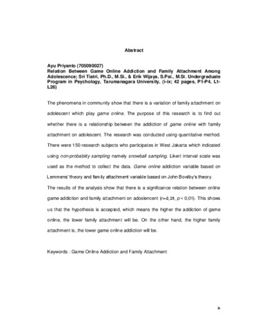 "The phenomena in community show that there is a variation of family attachment on adolescent which play game online. The purpose of this research is to find out whether there is a relationship between the addiction of game online with family attachment on adolescent. The research was conducted using quantitative method. There were 150 research subjects who participates in West Jakarta which indicated using non-probabiity sampling namely snowball sampling. Likert interval scale was used as the method to collect the data. Game online addiction variable based on Lemmens’ theory and family attachment variable based on John Bowlby’s theory.