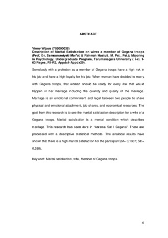 Wijaya, Vinny (2013) Gambaran Kepuasan Pernikahan Pada Istri Anggota Pasukan Gegana. Skripsi thesis, Universitas Tarumanagara.