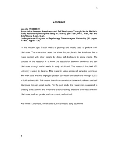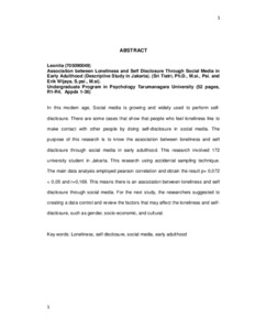 Leonita, Leonita (2013) Hubungan Antara Loneliness Dengan Self Disclosure Melalui Media Sosial Pada Dewasa Awal. Skripsi thesis, Universitas Tarumanagara.
