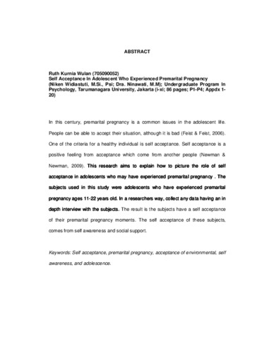 Wulan, Ruth Kurnia (2013) Self Acceptance Pada Remaja Yang Pernah Mengalami Kehamilan Pranikah. Skripsi thesis, Universitas Tarumanagara.