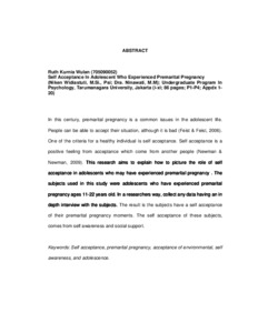 In this century, premarital pregnancy is a common issues in the adolescent life. People can be able to accept their situation, although it is bad (Feist & Feist, 2006). One of the criteria for a healthy individual is self acceptance. Self acceptance is a positive feeling from acceptance which come from another people (Newman & Newman, 2009). This research aims to explain how to picture the role of self acceptance in adolescents who may have experienced premarital pregnancy . The subjects used in this study were adolescents who have experienced premarital pregnancy ages 11-22 years old. In a researchers way, collect any data having an in depth interview with the subjects. The result is the subjects have a self acceptance of their premarital pregnancy moments. The self acceptance of these subjects, comes from self awareness and social support.