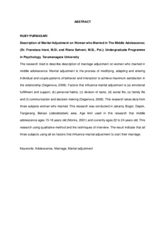 Purbasari, Ruby (2012) Gambaran penyesuaian diri pernikahan pada wanita yang menikah di usia remaja madya. Skripsi thesis, Universitas Tarumanagara.