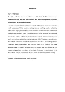 The research tried to describe description of marriage adjustment on women who married in middle adolescence. Marital adjustment is the process of modifying, adapting and altering individual and couple patterns of behavior and interaction to achieve maximum satisfaction in the relationship (Degenova, 2008). Factors that influence marital adjustment is (a) emotional fulfillment and support, (b) personal habits, (c) division of tasks, (d) social life, (e) family life and (f) communication and decision making (Degenova, 2008). This research takes data from three subjects woman who married. This research was conducted in Jakarta, Bogor, Depok, Tangerang, Bekasi (Jabodetabek) area. Age limit used in this research that middle adolescence ages 15-18 years old (Monks, 2001) and currently ages 22 to 24 years old. This research using qualitative method and the techniques of interview. The result indicate that all three subjects using all six factors that influence marital adjustment to start their marriage.