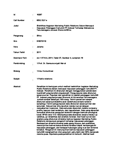 Elfira, Elfira (2011) Efektifitas Kegiatan Marketing Public Relations Dalam Mencapai Kepuasan Pelanggan Kartuim3 PT.Indosat Terhadap Mahasiswa Tarumanagara Jurusan Ekonomi/Elfira. Skripsi thesis, UNIVERSITAS TARUMANAGARA.