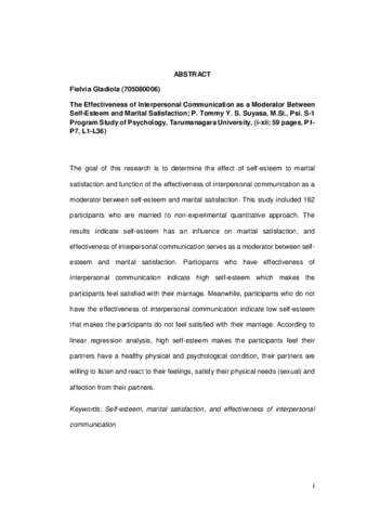 Gladiola, Fielvia (2012) Efektifitas Komunikasi Interpersonal Sebagai Moderator antara Self-Esteem dan Kepuasan Pernikahan. Skripsi thesis, Universitas Tarumanagara.