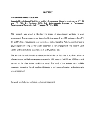 Indira Rahma, Annisa (2012) Pengaruh kesejahteraan psikologis terhadap work engagement (studi pada karyawan PT. CII dan PT. PAI). Skripsi thesis, Universitas Tarumanagara.