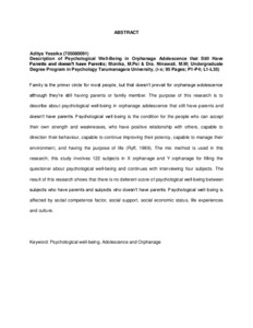 Yessika, Aditya (2012) Gambaran psychological well-being pada remaja panti asuhan yang masih memiliki orangtua dan yang sudah tidak memiliki orangtua. Skripsi thesis, Universitas Tarumanagara.