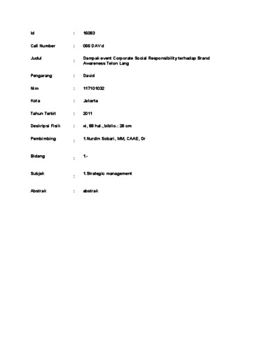 David, David (2011) Dampak event Corporate Social Responsibility terhadap Brand Awareness Telon Lang. Masters thesis, UNIVERSITAS TARUMANAGARA.