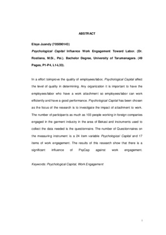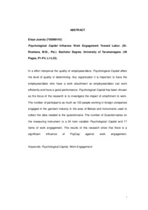 In a effort toimprove the quality of employees/labor, Psychological Capital affect the level of quality in determining. Any organization it is important to have the employees/labor who have a work attachment so employees/labor can work efficiently and have a good performance. Psychological Capital has been chosen as the focus of the research is to investigate the impact of attachment to work. The number of participants as much as 103 people working in foreign companies engaged in the garment industry in the area of Bekasi and instruments used to collect the data needed is the questionnaire. The number of Questionnaires on the measuring instrument is a 24 item variable Psychological Capital and 17 items of work engagement. The results of this research show that there is a significant influence of PsyCap against work engagement.