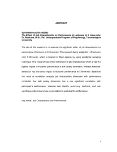 The aim of this research is to examine the significant effect of job characteristic on performance of lecturers in X University. This research being applied to 110 lecturers from X University which is located in West Jakarta by using accidental sampling technique. This research has shown dimension of job characteristic which is has the highest impact to lecturers’ performance is skill variety dimension, whereas feedback dimension has the lowest impact to lecturers’ performance in X University. Based on the result of correlation analysis job characteristic dimension with performance concluded that skill variety dimension has a low significant correlation with participant’s performance, whereas task identity, autonomy, feedback, and task significance dimensions has no correlation to participant’s performance.