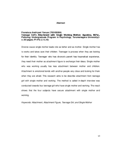 Divorce cause single mother leads role as father and as mother. Single mother has to works and takes care their children. Teenager is process when they are looking for their identity. Teenager who has divorce’s parent has traumatical experience, they need their mother as attachment figure to exchange their ideas. Single mother who was working usually has less attachment between mother and children. Attachment is emotional bonds with another people very close and looking for them when they are afraid. This research aims to be describe attachment from teenage girl with single mother and working. The method is called in-depth interview was conducted towards four teenage girl who have single mother and working. The result shows that the four subjects have secure attachment with single mother and working.