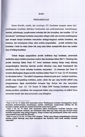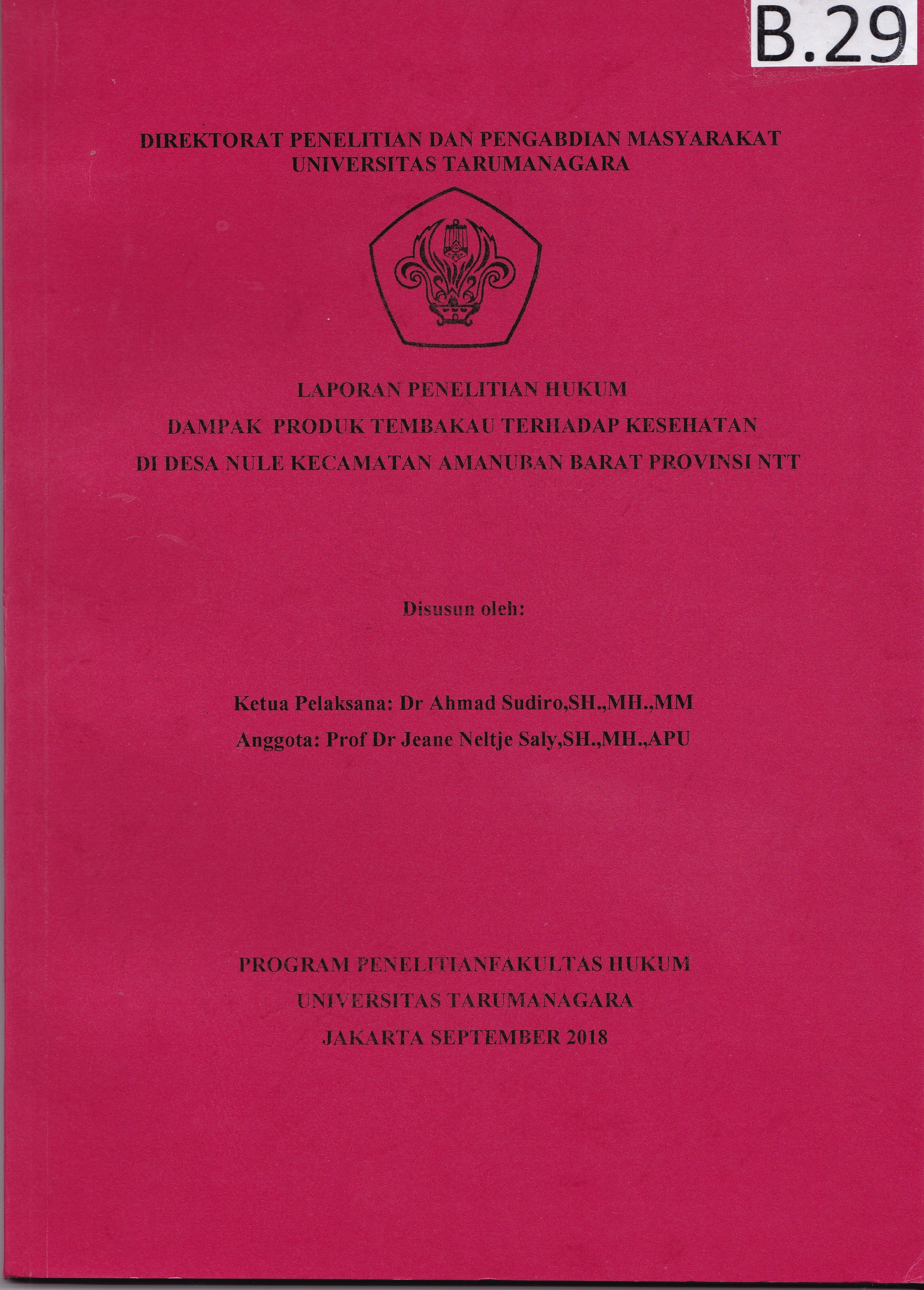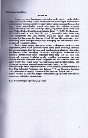 Dalam kaitan dengan perwujudan tujuan pembangunan untuk mencapai kesejahteraan, maka hukum dijadikan patokan utama, dalam melindungi kebutuhan hak asasi masyarakat, dalam menunjang berhasilnya pembangunan. Pelaksanaan tertib kehidupan bermasyarakat dalam lingkungan hidup yang baik dan sehat serta memperoleh pelayanan kesehatan memlalui kewajiban penghotmatan hak asasi manusia dilakukan pemerintah melalui pengaturan hak dan kewajiban, antara lain dalam memproduksi segala bahan yang dipergunakan agar tercipta kesehatan, baik dikonsumsi masyarakat, maupun pengaruhnya juga terhadap orang lain. Permasalahannya adalah bagaimana dampak produk tembakau terhadap kesehatan di Desa Nule Kabupaten Amanuban Barat Provinsi NTT; dan Bagaimana hambatan dalam pelaksanaan serta upaya pemerintah dalam mengatasi dampak tersebut Laporan penelitian ini membahas dampak tembakau terhadap kesehatan, hambatan dan upaya pemerintah dalam mengatasinya.
