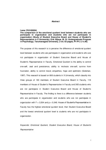 Ivana, Ivana (2014) Perbedaan Kecerdasan Emosional Antara Mahasiswa Yang Aktif Berorganisasi Dengan Mahasiswa Yang Tidak Aktif Berorganisasi (Studi Pada BEM dan DPM Fakultas Di Universitas X). Skripsi thesis, Universitas Tarumanagara.
