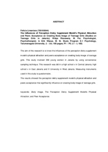 Limantara, Felicia (2014) Pengaruh Persepsi Daya Tarik Fisik Model Ikl;an Pelangsing Tubuh dan Penerimaan Teman Sebaya Terhadap Pembentukan Body Image Pada Remaja Putri. Skripsi thesis, Universitas Tarumanagara.