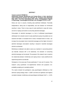 Mindfulness is believed to be able to serve as a treatment in overcoming alcohol use disorder, because with a full awareness, the sensation of consuming alcoholic beverage can be reduced. The purpose of this research was to examine the relationship between mindfulness and coping stress in early adulthood who experiencing alcohol use disorder.
