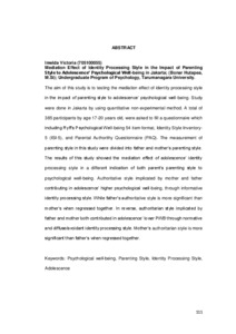 Victoria, Imelda (2014) Efek Mediasi Gaya Pemrosesan Identitas Terhadap Hubungan Antara Pola Asuh Dengan Psychological Well Being Remaja Di Jakarta. Skripsi thesis, Universitas Tarumanagara.