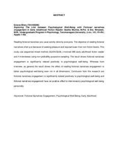 Misty, Eviana (2014) Hubungan Antara Fictional Narratives Engagement Dengan Psychological Well Being Pada Pembaca Novel Fiksi Usia Dewasa Awal. Skripsi thesis, Universitas Tarumanagara.