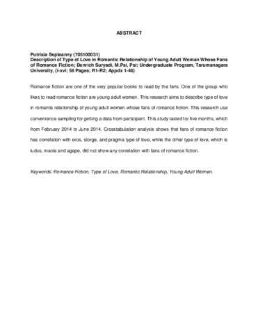 Septeanny, Putrisia (2014) Gambaran Tipe Cinta Dalam HUbungan Romantis Wanita Dewasa Muda Penggemar Cerita Fiksi Roman. Skripsi thesis, Universitas Tarumanagara.