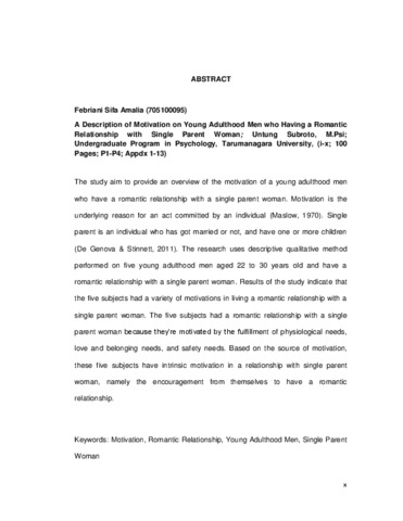 The study aim to provide an overview of the motivation of a young adulthood men who have a romantic relationship with a single parent woman. Motivation is the underlying reason for an act committed by an individual (Maslow, 1970). Single parent is an individual who has got married or not, and have one or more children (De Genova & Stinnett, 2011). The research uses descriptive qualitative method performed on five young adulthood men aged 22 to 30 years old and have a romantic relationship with a single parent woman. Results of the study indicate that the five subjects had a variety of motivations in living a romantic relationship with a single parent woman. The five subjects had a romantic relationship with a single parent woman because they’re motivated by the fulfillment of physiological needs, love and belonging needs, and safety needs. Based on the source of motivation, these five subjects have intrinsic motivation in a relationship with single parent woman, namely the encouragement from themselves to have a romantic relationship.