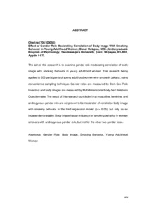 The aim of this research is to examine gender role moderating correlation of body image with smoking behavior in young adulthood women. This research being applied to 203 participants of young adulthood women who smoke in Jakarta, using convenience sampling technique. Gender roles are measured by Bem-Sex Role Inventory and body images are measured by Multidimensional Body-Self Relations Questionnaire. The result of this research concluded that masculine, feminine, and androgynous gender role are not proven to be moderator of correlation body image with smoking behavior in the third regression model (p > 0.05), but only as an independent variable. Body image has an influence on smoking behavior in women smokers with androgynous gender role, but not for the other two gender roles.